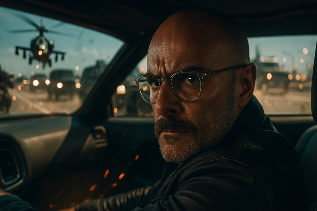 Ultra-realistic cinematic close-up shot a man (image uploaded) wears black jacket from inside a roaring black muscle car speeding down a highway in bright daylight. The camera is positioned beside the hero driver, capturing his intense expression with sharp, natural sunlight illuminating his face and interior details. Clear reflections of chaos fill the windshield — multiple motorcycles swarming beside the car, armored SUVs in pursuit, and a tactical helicopter above locking its spotlight on the vehicle. Strong directional daylight, crisp shadows, high clarity environment, motion blur, sparks, drifting smoke, and shattered debris flying on the highway. Intense high-speed chase atmosphere, gritty action tone, hyper-detailed car interior, shallow depth of field, anamorphic lens.Foto original