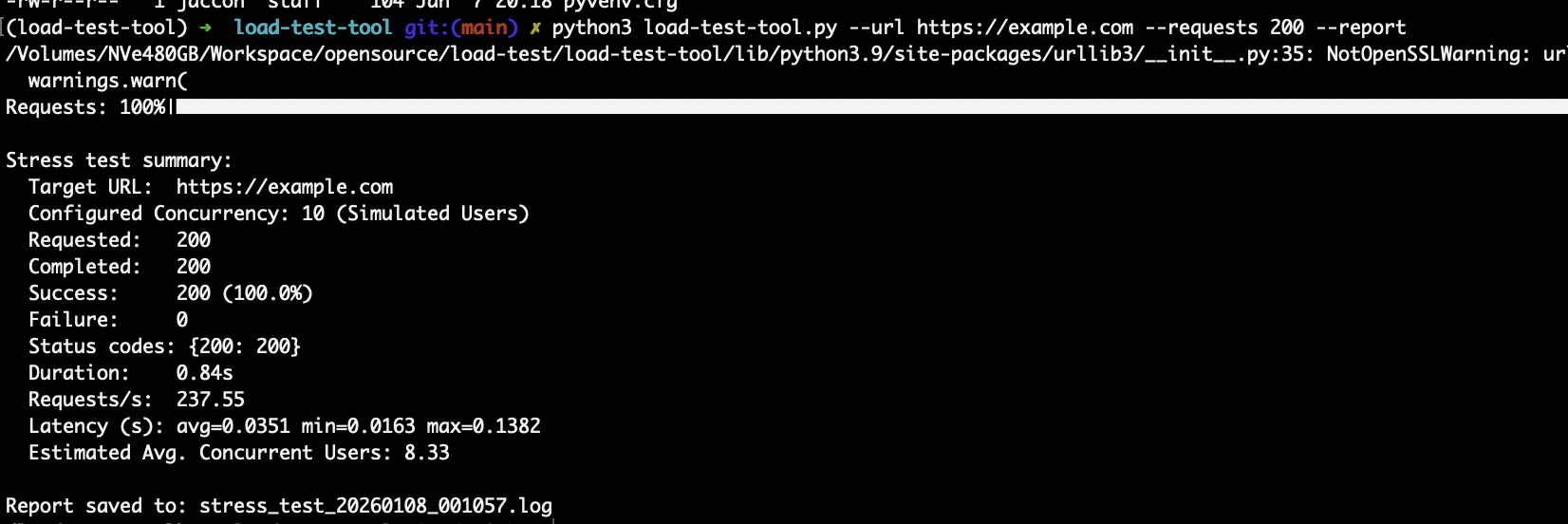 At the end of each execution, the tool prints a concise summary that highlights the effective load applied to the system and how it responded. The estimated average concurrent users metric is particularly useful, as it reflects the actual pressure exerted on the system rather than just the configured thread count.
